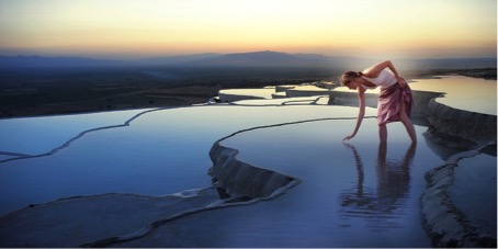 Pamukkale, meaning "cotton castle", is a natural attraction in south-western Turkey’s Denizli province. Unique in the world, Pamukkale resembles a frozen waterfall, with white layers of limestone and travertine cascading down a mountain slope approximately 2700m in length and 160m in height. Thermal spring waters, laden with calcareous salts running off the plateau’s edge, have created a fantastic formation of stalactites, cataracts and basins. At the end of the 2nd century BC, the dynasty of Attalid, the king of Pergamon, established the thermal spa of Hierapolis close by. Situated on a plateau, we find both the thermal centre and the ruins of the ancient city of Hierapolis. The ruins of the baths, temples and other monuments can be observed at the site.